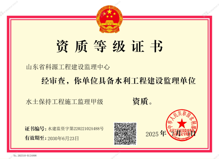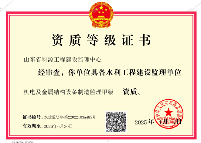 山东省科源工程建设监理中心(以下简称“本中心”),为1996年12月经山东省水利厅批准成立,由山东省水利科学研究院全额投资的省级全民所有制企业,注册资本金300万元。具有水利部颁发的水利工程施工监理甲级资质、水土保持工程施工监理甲级资质、机电与金属结构设备制造监理甲级资质、水利工程移民监理资质,连续15年被水利部评为全国水利市场信用AAA级企业。为全国水利行业内单位资质专业种类最全、等级最高、信誉度最好的监理企业。拥有“山东科源”齐鲁建造品牌称号。
